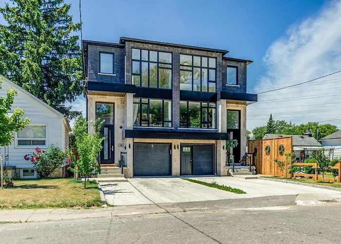 New Build 4 Bedroom-Beach Vibes In The City ferielejlighed ligger i Scarborough område af Toronto og har en terrasse. Værelserne har kaffemaskiner/tekedler og et køleskab i et fuldt udstyret køkken og kaffe- og tefaciliteter, et skrivebord, et fladskærms TV med satellitkanaler i alle værelser.